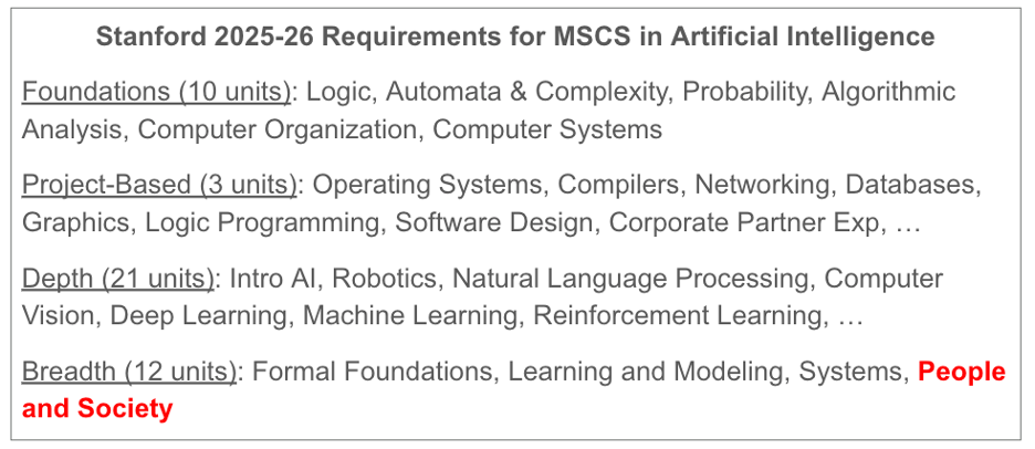 Fig 1. Stanford’s 2025-26 Requirements for a CS Master’s specialization in AI (source). Nearly all course tracks have remained the same in the last decade. The subrequirement containing AI ethics courses is People and Society; however, this requirement can be subverted by taking applied geometry courses like CS148 (Computer Graphics) in lieu of AI ethics. Some courses embed AI ethics units at the discretion of individual instructors.