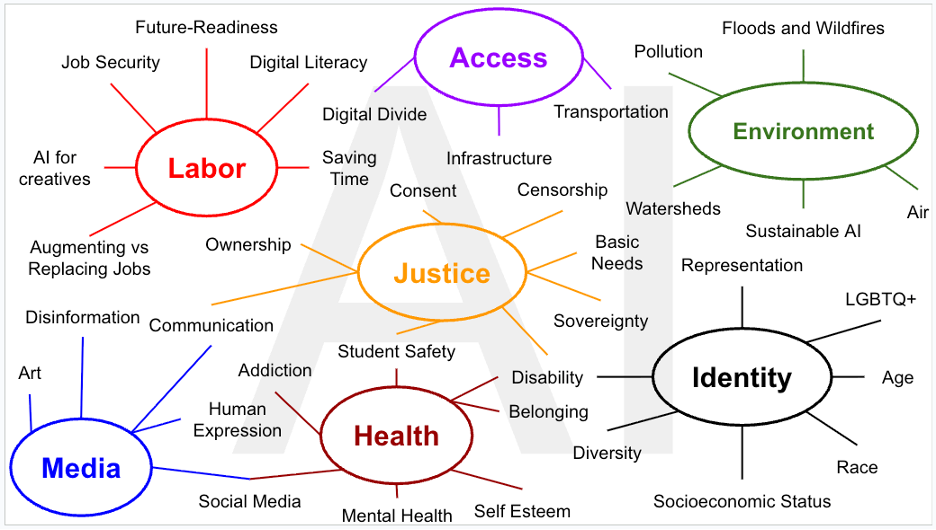Fig 2. Participatory concept map of AI ethics literacy, based on 64 interviews conducted with K-12 students, educators, and AI justice practitioners in the YDSL community.